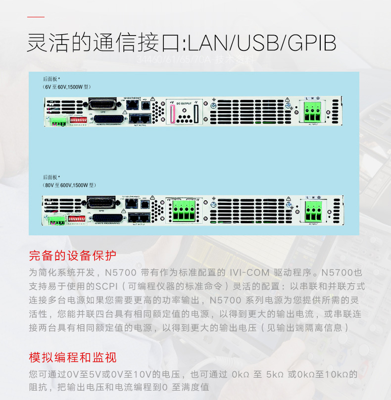 • 描述N5769A 单路输出 1500 W 电源提供通用交流输入,并且符合 GPIB、LAN、USB 和 LXI 标准,能够实现对输出电压和电流的模拟/电阻控制。