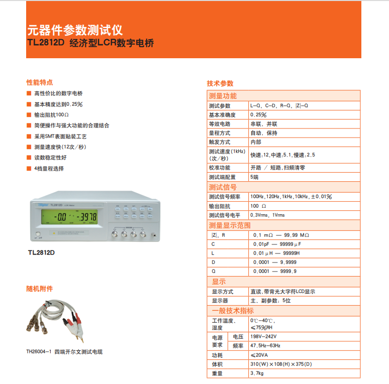 • 描述TL2812D型LCR数字电桥是本公司最新研制的低频元件测量的换代产品, 其中应用多项元件测量的最新技术,大字符LCD显示,采用SMT贴片工艺,操作方便,外形美观。可满足生产线质量保证、进货检验及自动化生产的需要。TL2812D为常州同惠最新推出的一款低价LCR数字电桥,可替代TH2811D,在夹具方面采用了TH26004s-1四端开尔文测试电缆,但精度由TH2811D的0.2%改为0.25%,内阻恒定100欧姆。