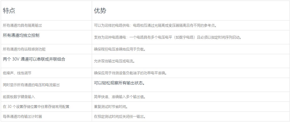使用 360W、720W 或 1080W 2260B 系列可编程直流电源提供各种电压和电流。360W 型可输出 36A、13.5A、4.5A 或 1.44A 的电流;720W 型可输出 72A、27A、9A 或 2.88A 的电流;1080W 型可输出 108A、40.5A、13.5A 或 4.32A 的电流。2260B 型电源的电压和电流输出范围广,有多种接口选择,特别适合各种各样的应用,包括研究与设计、质量控制和生产测试。