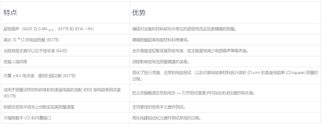 • 描述从三个敏感选项中选择,实现精确的高阻抗和低电流测量。5½ 位 6514 型和 6517B 型静电计提供 1fA 灵敏度,输入阻抗 >200TΩ 的电压测量,以及低至 10fC 的电荷测量。6½ 位 6430 型亚 fA 远程 SourceMeter SMU 仪器能够以 1aA 的灵敏度测量电流。其噪声低、偏差小,非常适用于研究单电子器件、高电阻纳米线和纳米管、聚合物以及电化学应用。