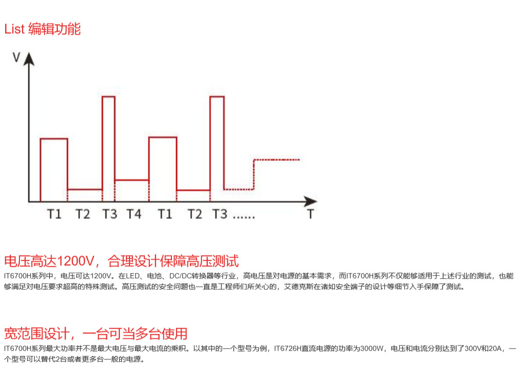 • 描述IT6700H高压直流电源,输出功率可达3000W,电压0-1200V,电流0-110A可调,具有桌面型和上架安装功能,操作更方便。提供list模式,内置RS232/USB通讯接口,具有丰富的SCPI指令,方便组建各种智能化的测试平台。广泛应用于电池充电测试、功率半导体器件静态参数测试、电解电容、电源模块电性能以及机电控制领域等需要使用高压低流直流电源的领域。