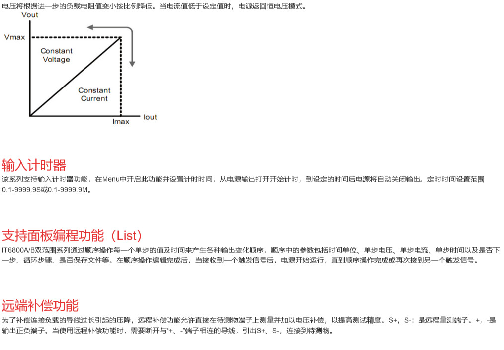 • 描述IT6800A/B系列双范围可编程直流电源(72-180W),每台电源具有两个电压、电流输出范围,一台电源可以当两台使用,更大节约使用者的成本和空间。具有1mV / 0.1mA的高分辨率。同时支持面板List编程和通过计算机进行软件操作,满足更多的通讯需求。适用于实验室测试、产线生产测试、维修检测等。