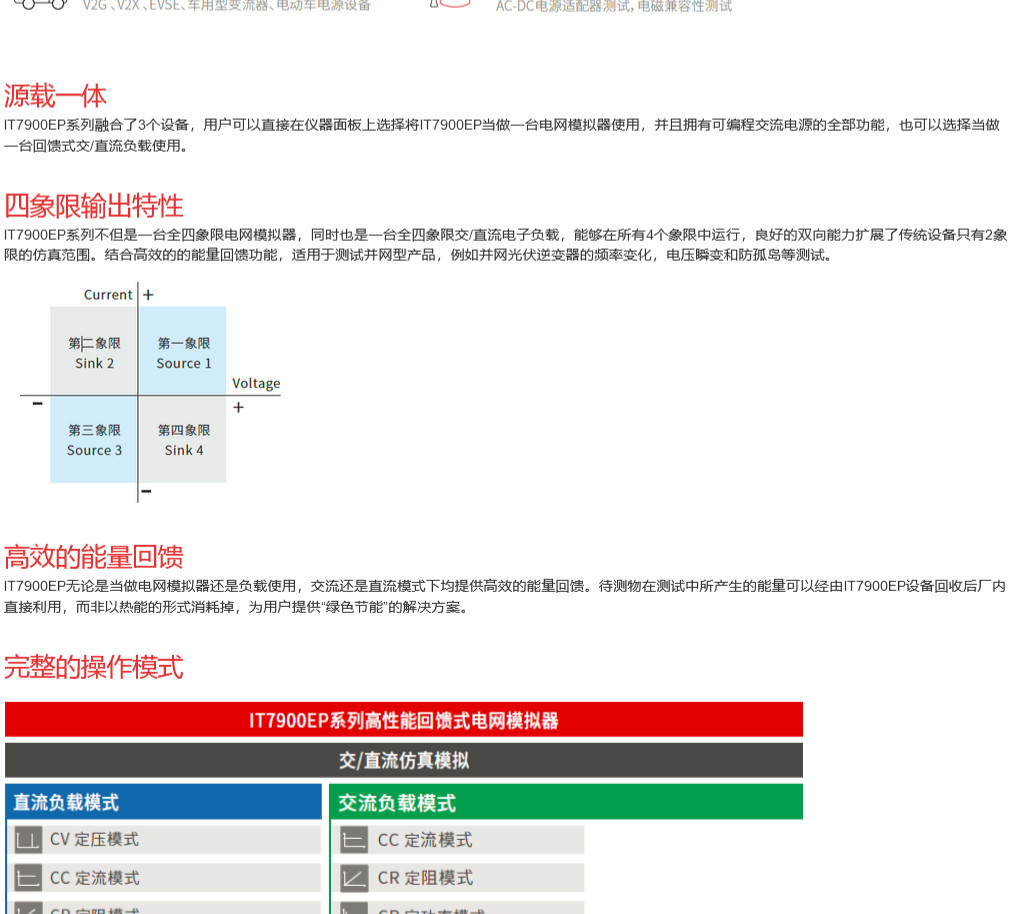 • 描述IT7900EP系列高性能回馈式电网模拟器提供用户领先的一体化测试解决方案,全系列采用碳化硅(SiC)技术,可以是一台大功率交流电源,也可以作为电网模拟器使用,同时也是一台回馈式的交/直流电子负载。全四象限运行,高效的回馈能力可以将电能无污染的回馈电网,满足环保需求的同时也节省了大量用电和散热成本。紧凑式、模块化、高效率的结构设计,使IT7900EP可以在3U的体积内提供21kVA的功率,主从并联更可扩展功率至1MVA以上