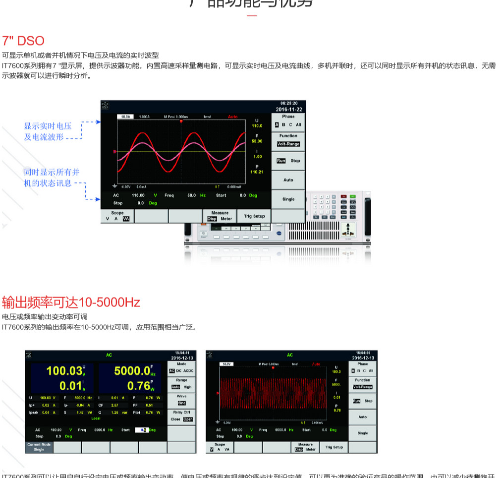 - 描述IT7600 系列高性能可编程交流电源采用数字信号处理技术,功率从750VA覆盖到4500VA,频率高达5kHz。内置功率表及大屏幕示波器功能,支持主从并联,可提供大容量的交直流输出。IT7600 内建任意波型产生器, 可模拟谐波及各种任意波形输出, 同时具有交流测量及分析功能,可广泛应用于新能源、家电产品、电力电子、民用航空电子设备、IEC 标准测试、煤矿钢铁化工设备测试的开发和运用等多个领域。