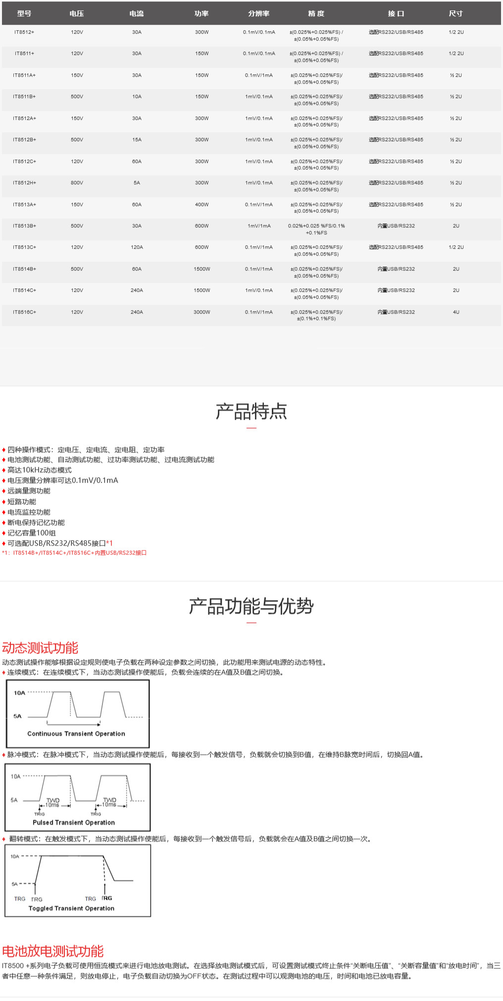- 描述IT8500+系列是单路输入可编程直流电子负载,拥有高密度体积,高分辨率和高精度,同时具有动态测试和自动测试等多种测试功能,可应用于LED driver测试,开关电源测试,电池性能检测等多个行业领域,也可以提供标准SCPI通讯协议,方便组建智能化测试平台应用于多个行业。