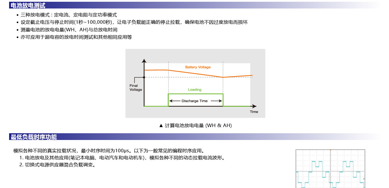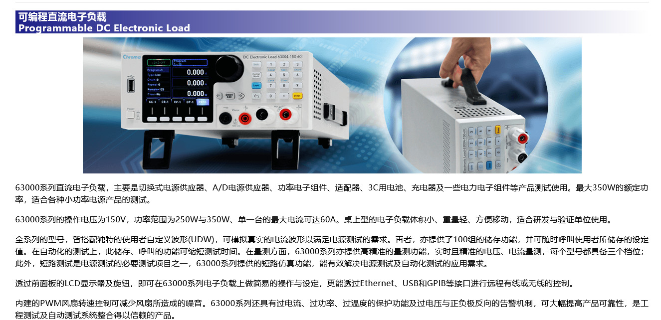 • 描述63000系列直流电子负载,主要是切换式电源供应器、A/D电源供应器、功率电子组件、适配器、3C用电池、充电器及一些电力电子组件等产品测试使用。最大350W的额定功率,适合各种小功率电源产品的测试。