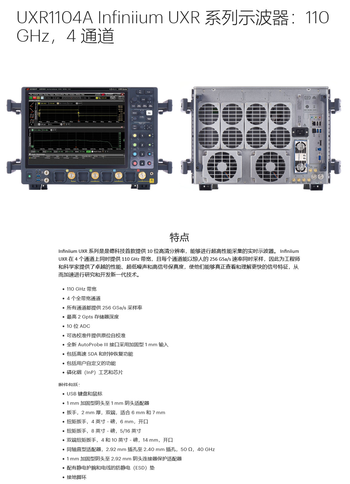 • 描述UXR1104A 是一款 Infiniium UXR 系列实时示波器,拥有 110 GHz 带宽和 4 个通道