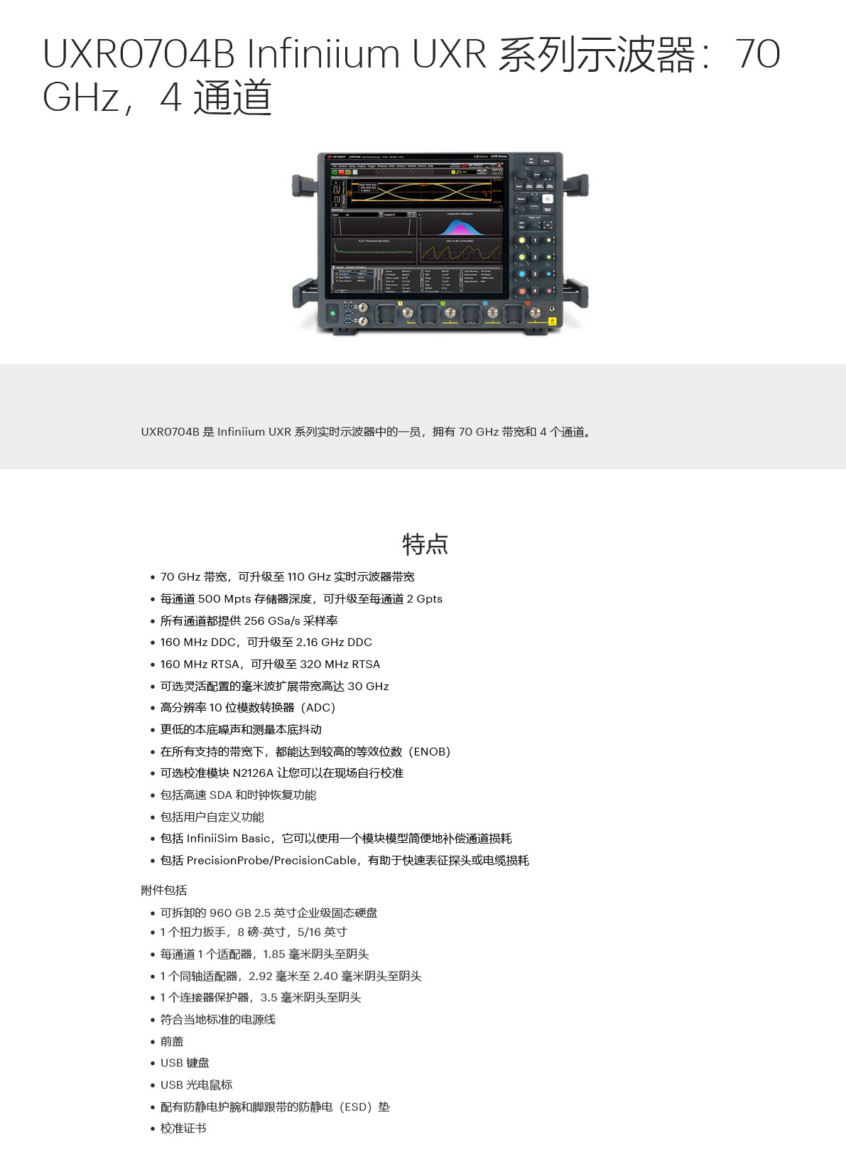 • 描述UXR0704B 是 Infiniium UXR 系列实时示波器中的一员,拥有 70 GHz 带宽和 4 个通道