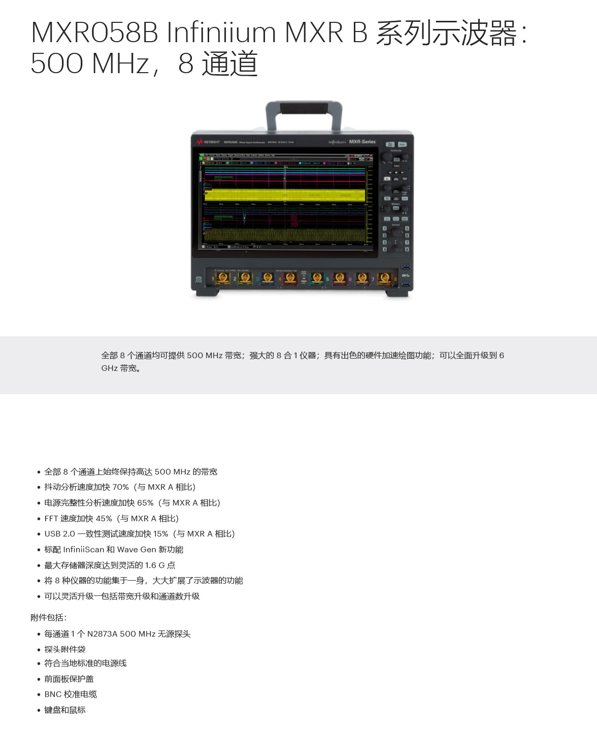 • 描述全部 8 个通道均可提供 500 MHz 带宽;可通过选件构成强大的 8 合 1 仪器;具有出色的硬件加速绘图功能;可以全面升级到 6 GHz 带宽