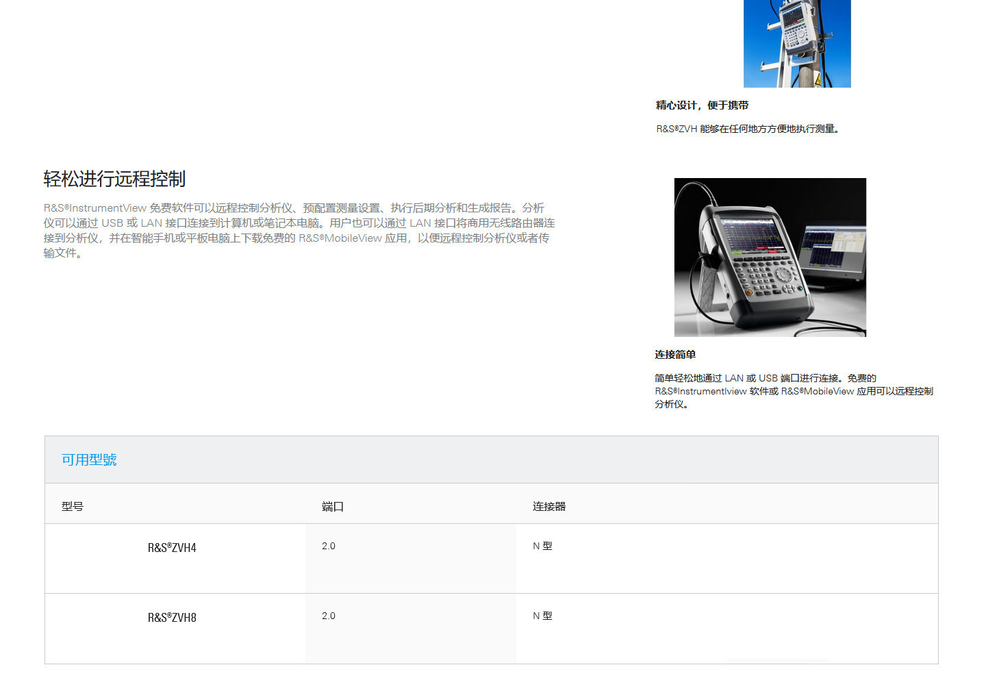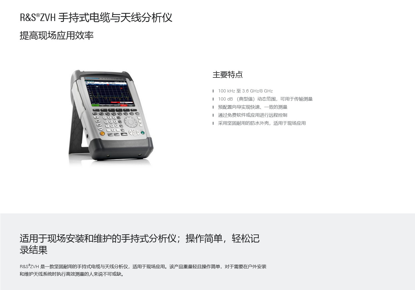 • 描述ZVH 是一款坚固耐用的手持式电缆与天线分析仪,适用于现场应用。该产品重量轻且操作简单,对于需要在户外安装和维护天线系统时执行高效测量的人来说不可或缺。