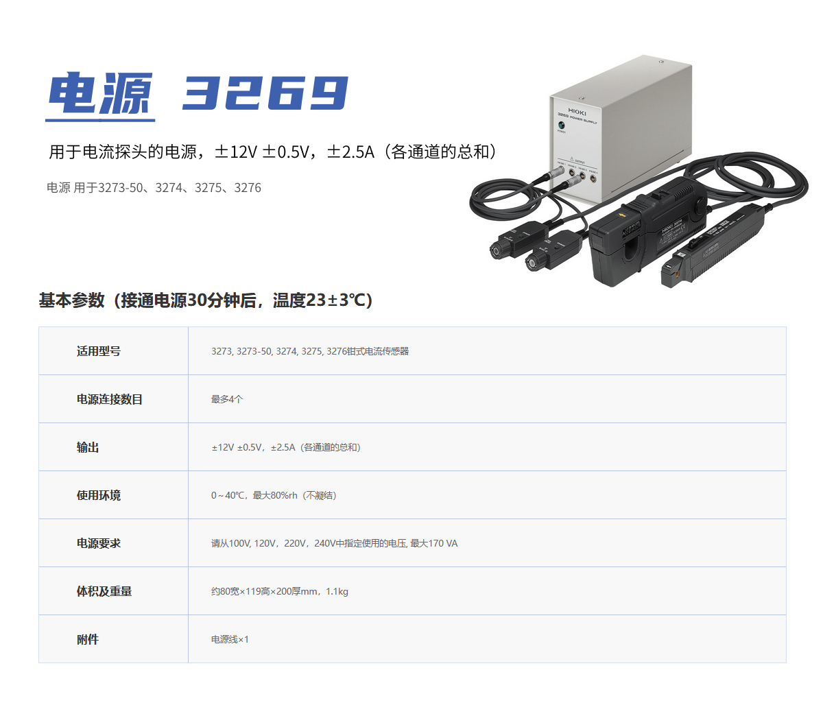 • 描述用于电流探头的电源,±12V ±0.5V,±2.5A(各通道的总和) 电源,适用于3273, 3273-50, 3274, 3275, 3276钳式电流传感器。