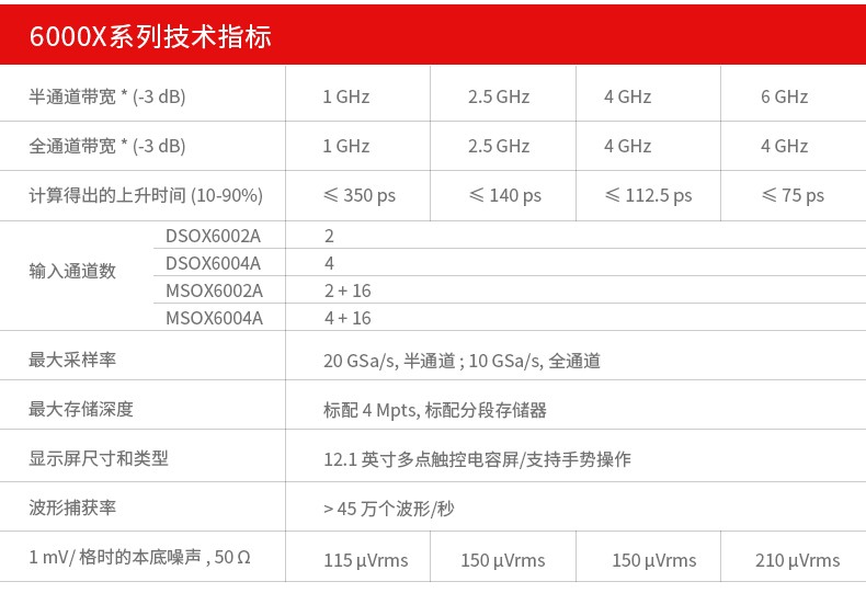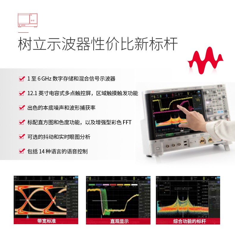 • 描述6000 X 系列提供 12.1 英寸的多点触控触摸屏、InfiniiScan 画图触发、语音控制,6 种仪器功能集中在一台示波器里。
